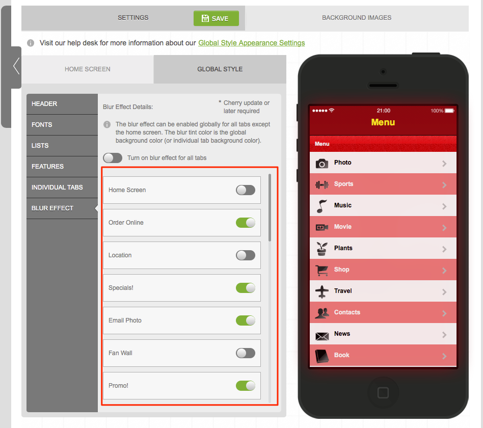Head over to the Appearance Step -> Settings. Under Global Settings you will now see a new option titled Blur Effect. Here you have a couple options.