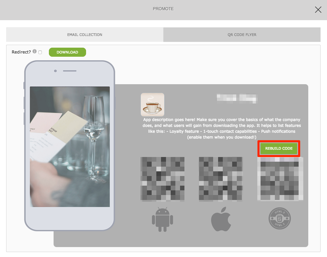 3. Click Rebuild Code to sync up your new HTML5 URL. Once complete, use a QR scanner app to test out your HTML5 URL and confirm it's directing you properly.