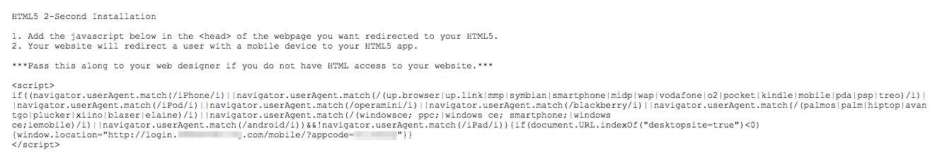 2. Copy the redirect script and paste it into the header of the front-end site's home page. This is only possible if you have access to edit your website's code. (Note: Don't add this script to each page of the front-end site, because that will result in an endless loop that prevents users from visiting specific pages of your front-end site on their phone. The home page header is enough.)