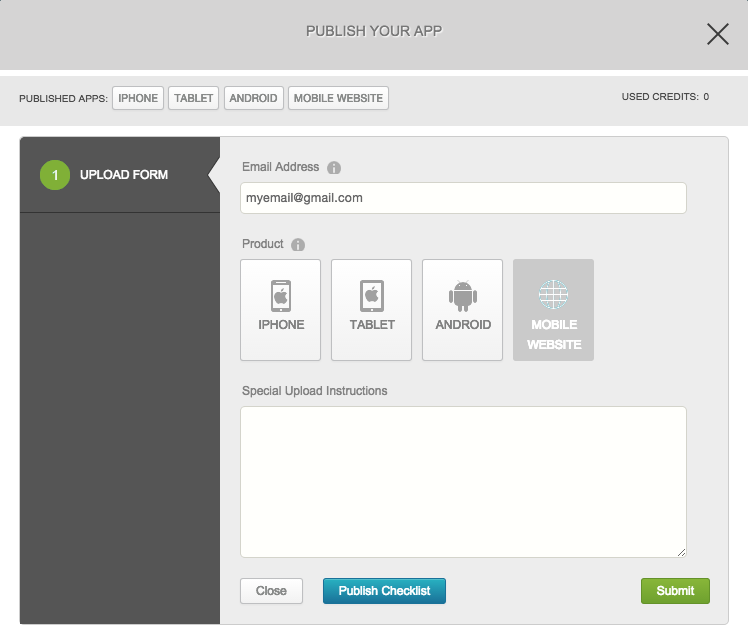 3. In the pop-up window, provide your Email Address and click the Mobile Website option. In the Special Upload Instructions window, you can just write "N/A."